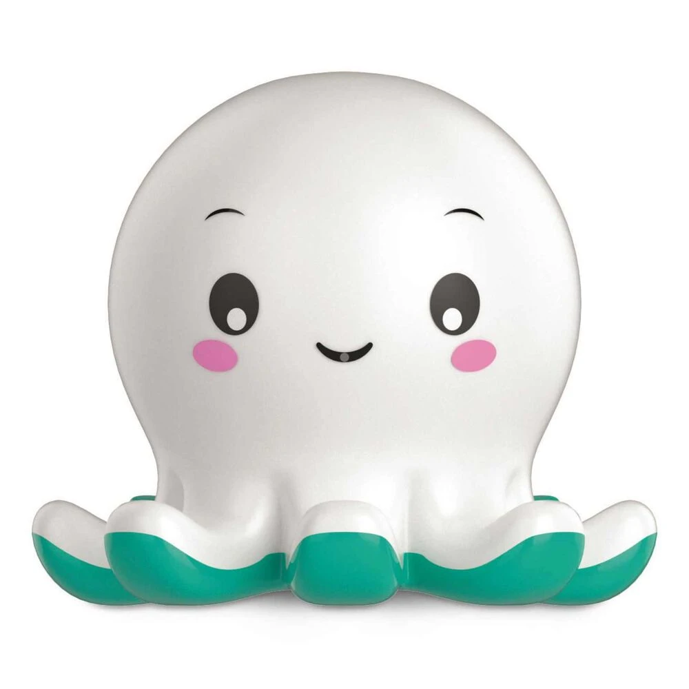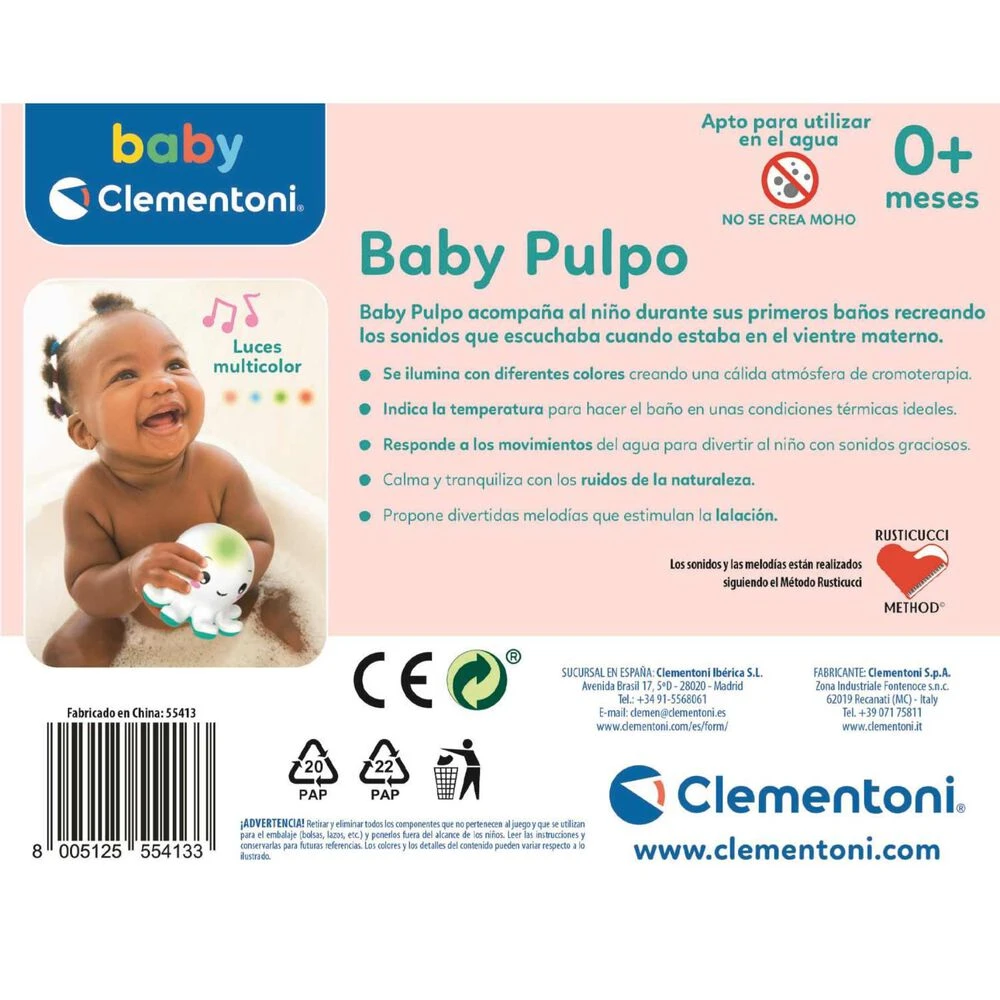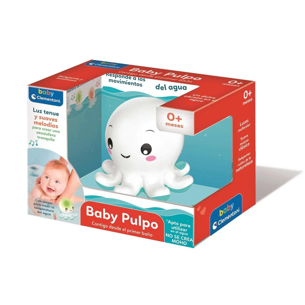 Un dulce pulpo interactivo para el primer baño de un niño. Este lindo juguete de baño está diseñado para entretener y calmar a los niños durante su primer baño, recreando un ambiente tranquilo y relajante similar al del vientre de su madre. Dependiendo del modo, el pulpo se ilumina con luces diferentes colores y un efecto de cromoterapia para relajar al niño o toca melodías dulces para calmarlo y fomentar el balbuceo. Si el niño juega con el pulpo moviéndolo, se ríe para entretenerlo y atraer su atención. Un juguete ideal para que los niños jueguen en el baño durante sus primers meses.