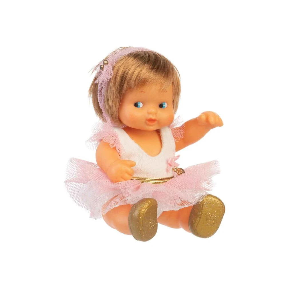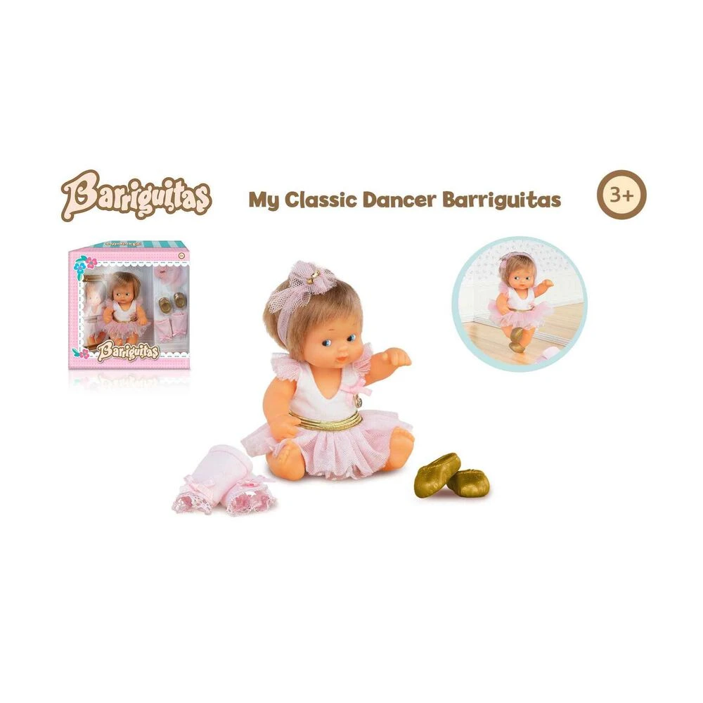 Barriguitas Bailarina de Ballet viene con un traje de bailarina con tul, repleto de detalles dorados y con una diadema de tul a juego con el tutú. Además, incluye unos zapatos de baile, y unos calentadores para jugar a llevar a tus bebés a clases de Ballet