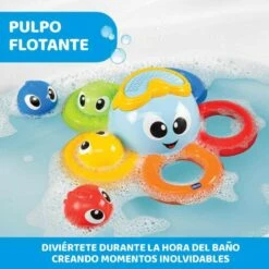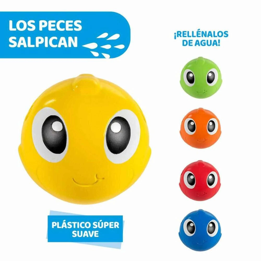 Billy y sus pequeños amigos con forma de pez globo nadarán felices en la bañera y acompañarán al bebé durante sus baño. Con diferentes actividades: Podrás colocar todos los peces en los tentáculos de Billy para estimular la asociación lógica entre los colores de los tentáculos y los colores de los peces. Podrás intentar encestar los peces en su respectivo color. O podrás coloca a Billy bajo el agua, sácalo boca abajo y crea un fantástico efecto de lluvia. Edad recomendada: De 6 a 36 meses.