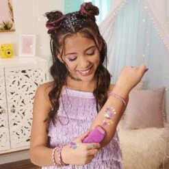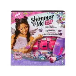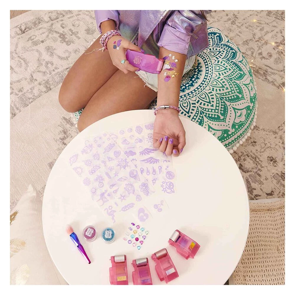 El estudio Shimmer Me de tatuajes temporales tiene todo lo que necesitas para personalizar tu propio arte corporal: 4 películas metalizadas, 2 colores de purpurina, 1 brocha para la purpurina, joyas, 1 rodillo y 180 diseños disponibles. Con el juego de tatuajes para niñas Shimmer Me Body Art exprésate como eres. Coloca un cartucho de aluminio en el rodillo y ponlo sobre la pegatina para revelar tu arte corporal. Los tatuajes temporales duran aproximadamente 24 horas; el adhesivo apto para la piel se quita fácilmente con agua tibia. Crea atractivos diseños con el estudio de tatuajes para niñas y cambialos cuando quieras. Elige entre 180 modernos diseños de pegatinas de doble cara y personaliza tu arte corporal como quieras. Mezcla y combina diseños y efectos metálicos, y luego decora el tatuaje temporal con purpurina y gemas para darle tu toque personal. Brilla con los tatoos infantiles Shimmer Me Body Art. Contenido: 1 rodillo de arte corporal Shimmer Me, 4 cartuchos de película, 4 hojas de pegatinas de doble cara, 2 botes de purpurina, 1 hoja de joyas, 1 brocha para purpurina, 1 guía de instrucciones. Edad recomendada: + 8 años. No recomendable para menores de 3 años, ya que contiene piezas pequeñas que podrían provocar asfixia en caso de ser ingeridas por el niño/a.