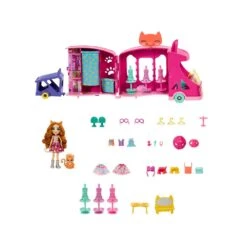 ¡Las Enchantimals™ y sus mascotas celebran la Glam Party™ y todo el mundo está invitado! Niños y niñas pueden organizar su propio desfile de moda en cuanto el Camión de estilismos llegue a la ciudad con una muñeca Enchantimals™ de 15,24cm al volante. Al abrir el camión, encontrarás todo lo que necesitas para celebrar una fiesta de moda de lo más glamurosa. En su interior hay prendas extravagantes, maniquíes, un probador, una mesa y mucho más. ¡Incluye en total más de 25 piezas de moda de alto nivel! Trae incluso un remolque que se engancha en la parte de atrás del camión para llevar a la figura incluida de la mascota mejor amiga.