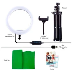 El móvil se coloca en el soporte y, posteriormente, en el trípode, que se puede extender hasta 50 cm. El aro de luz graduable sirve para dar la iluminación adecuada y la pantalla verde funciona para poner imágenes de fondo a los vídeos y hacerlos más atractivos.