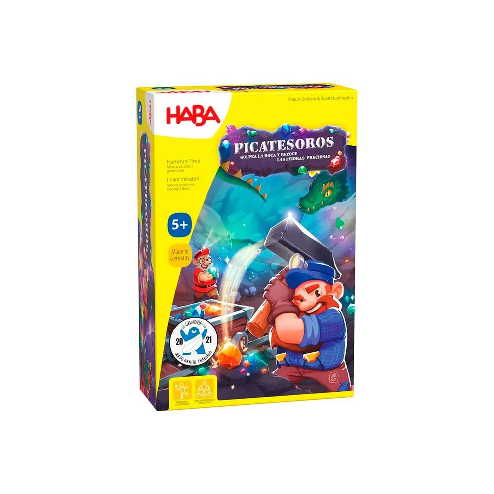 ¡Esta mina está llena de gemas maravillosas! Pon a prueba tu habilidad minera con el martillo y consigue llenar tus 4 vagonetas antes que el resto de mineros. En este juego tendrás que templar tus nervios cuando sea tu turno para golpear con el martillo, ¡no te pases de fuerza o te quedarás sin gemas! Recolecta todas las que puedas de los colores que correspondan según marquen las cartas, para poder llenar tus vagonetas y ganar el juego.
