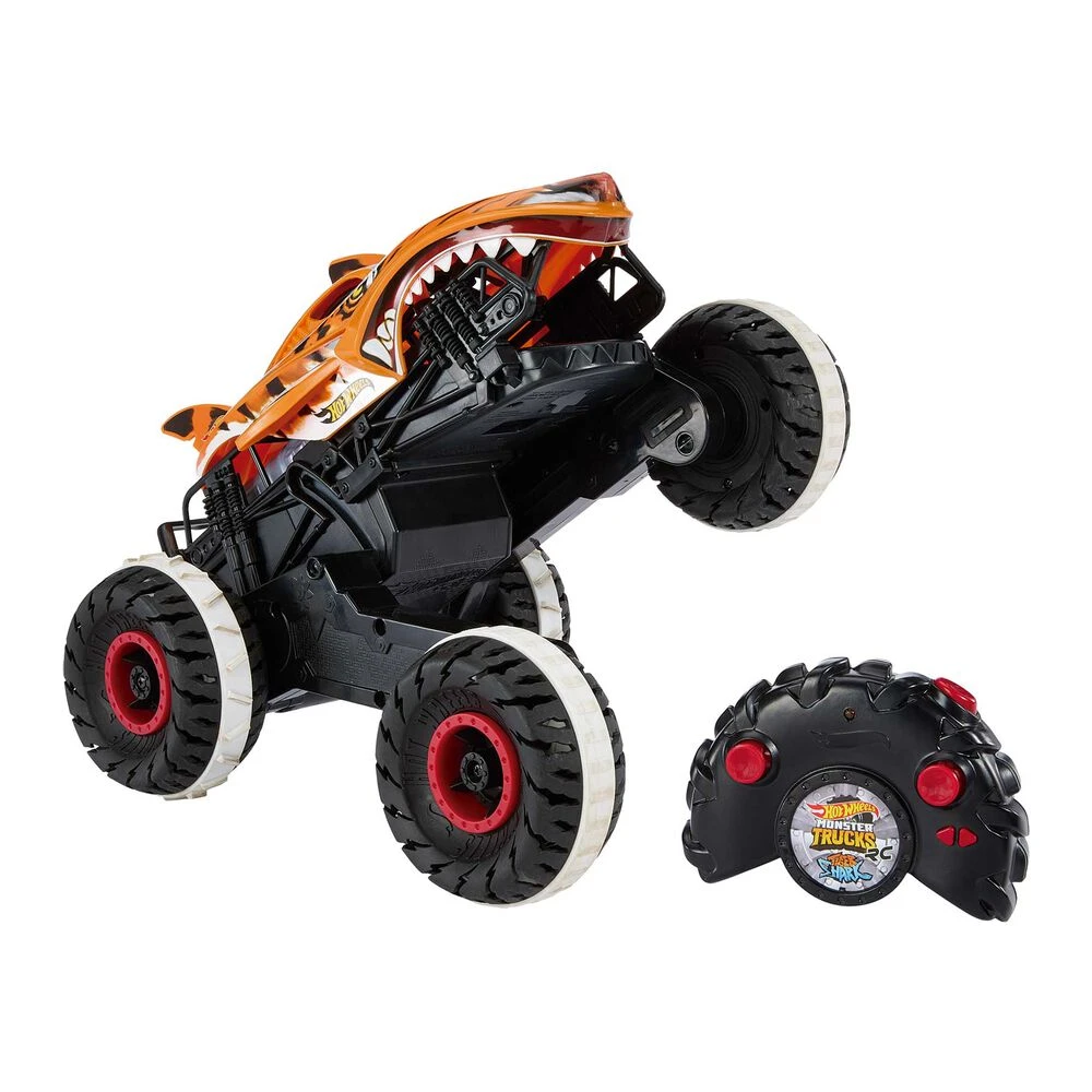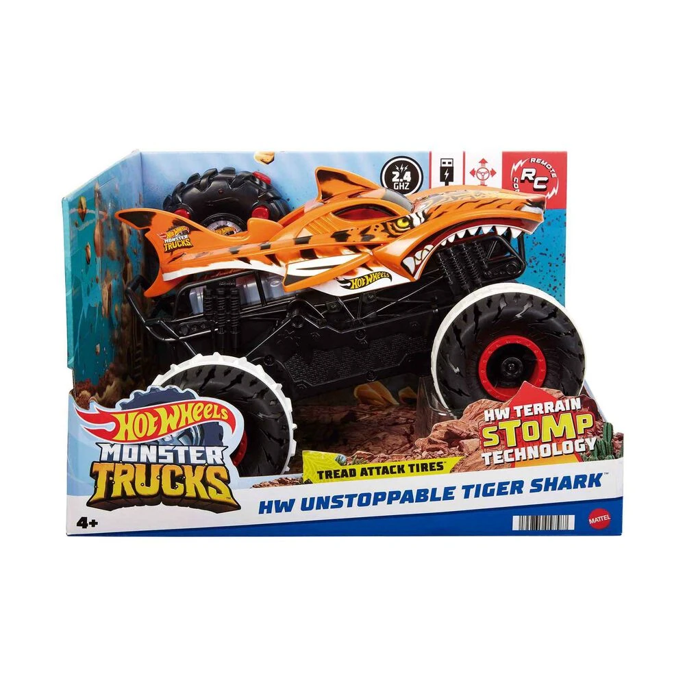 Corre y atraviesa todo tipo de parajes con el vehículo con control remoto Monster Trucks HW Unstoppable Tiger Shark™ de Hot Wheels®. Esta bestia en forma de Monster Truck con control remoto busca a su presa con la HW Terrain Stomp Technology™ para ´aplastar´ la hierba, las rocas, la pista e incluso los coches de Hot Wheels®. (Los vehículos adicionales se venden por separado). Se recarga con el cable USB incluido para disfrutar del juego durante 25 minutos y tiene un alcance de 30,5metros. Pásate al modo bestia con sus temibles ruedas, una estabilidad inigualable y una fuerza imparable. Este vehículo a escala 1:15 presenta todo lujo de detalles y cuenta con funciones de control remoto, carga USB y una velocidad de hasta 9,7km/h. Los colores y la decoración pueden variar. El vehículo con control remoto Monster Trucks HW Unstoppable Tiger Shark™ de Hot Wheels® es el regalo perfecto para los fans del control remoto y los niños y niñas a partir de 4 años. No recomendable para menores de 3 años, ya que contiene piezas pequeñas que podrían provocar asfixia en caso de ser ingeridas por el niño/a.