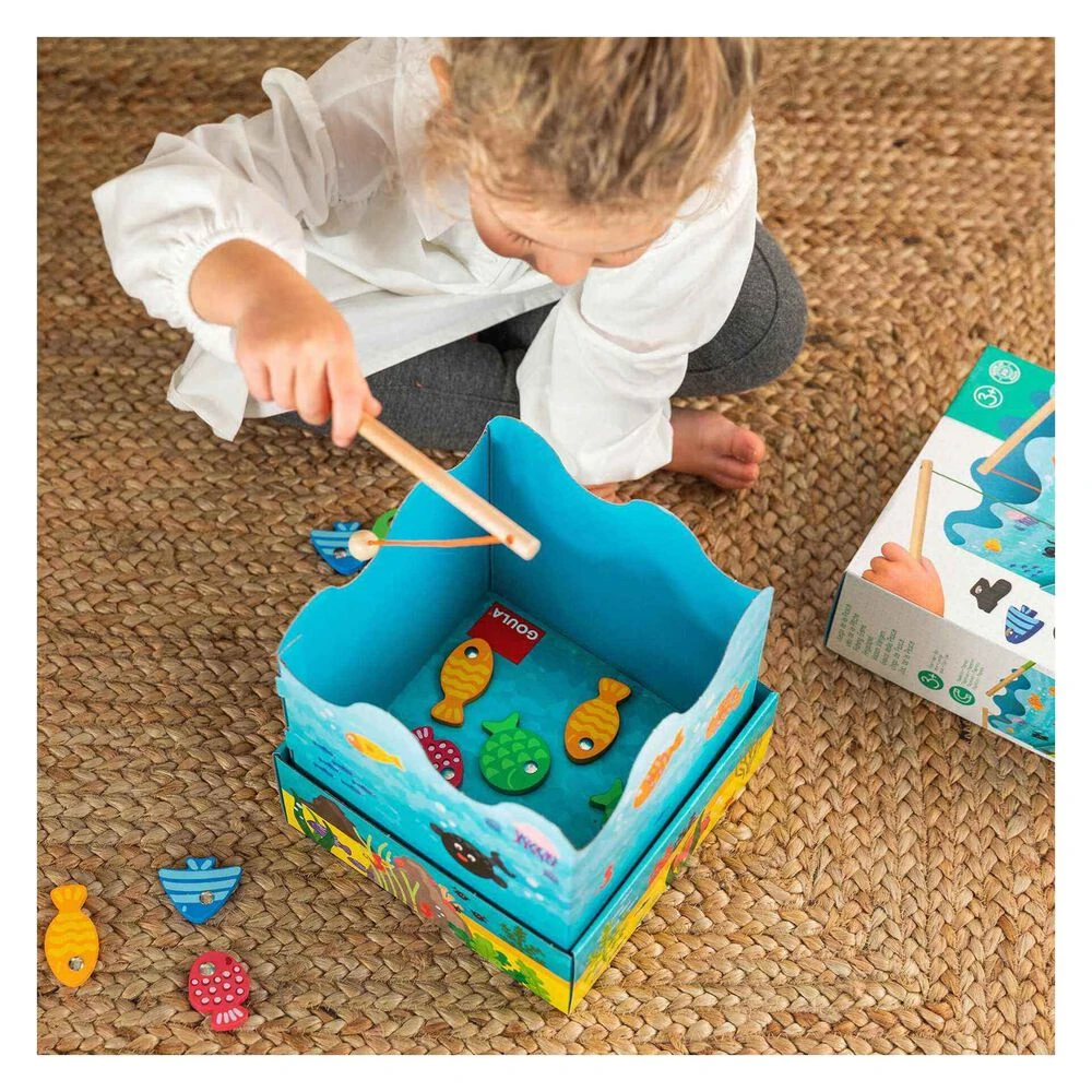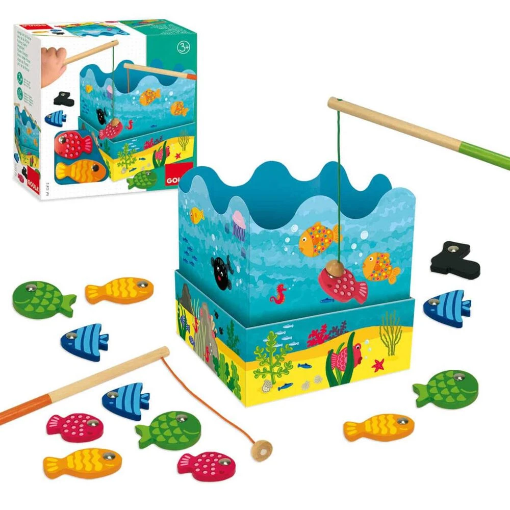 ¡Consigue ser el mejor pescador! Las cañas y peces de madera de colores son magnéticos. Divertido juego de acción en el que existen dos modalidades distintas: en la primera cada jugador tiene que coger cuantos más peces mejor; en la segunda, cada jugador pesca los peces del color que haya elegido. Juguete recomendado para niños a partir de 2 años.