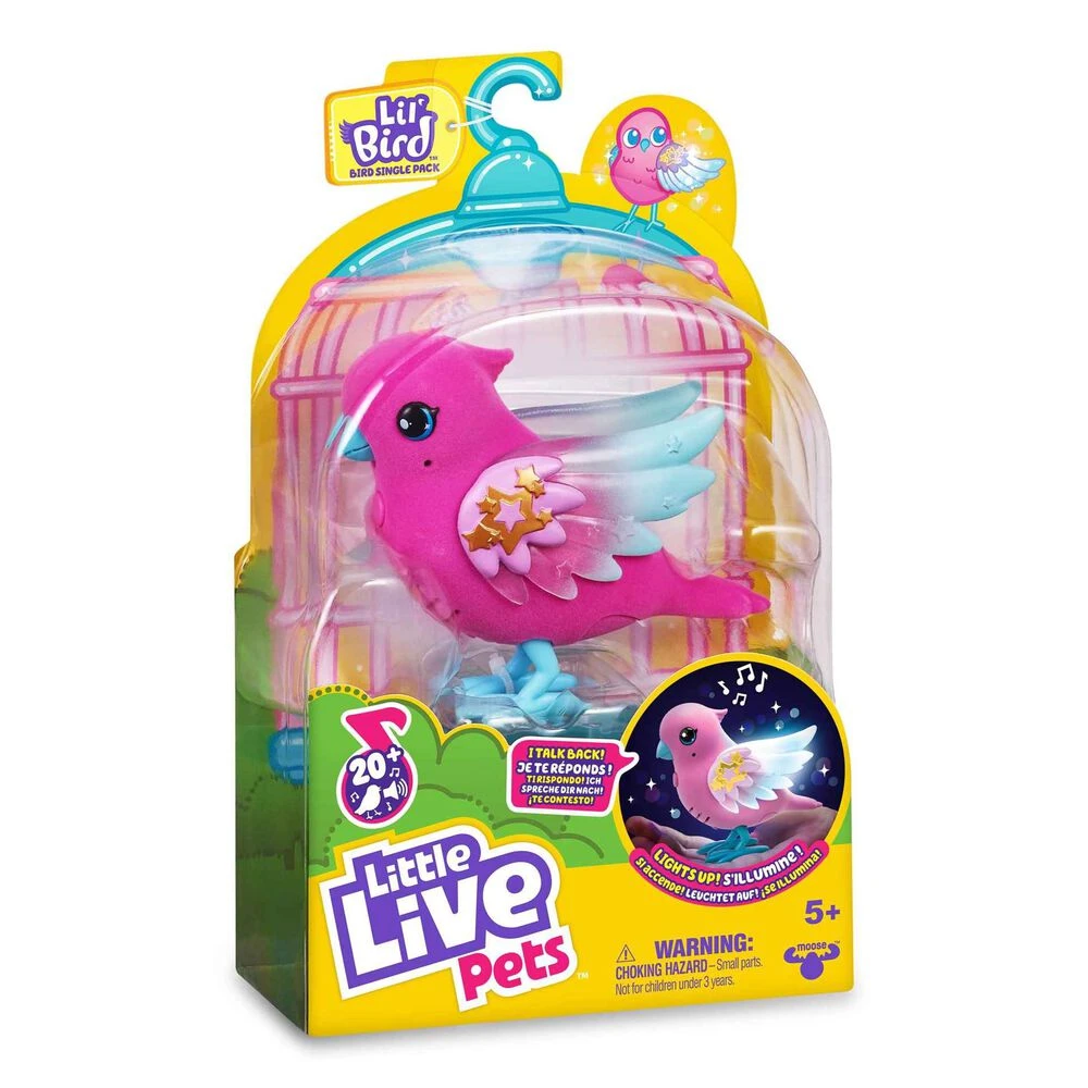 ¡Los pájaros parlanchines están de vuelta! Vuelven los pájaros parlanchines con dos nuevos modelos, Skyler y Twinkle. A estos pajaritos se les encienden y repiten lo que dicen los niños cuando pulsan el botón de su tripa.Las alas de Skyler están ambientadas en el cielo estrellado de noche y las de Twinkle en las aguas marinas porque le encanta volar sobre el océano. Además, tienen más de 20 sonidos y reacciones. Cada uno se vende por separado.Necesita pilas, 2xAAA (no incluidas).