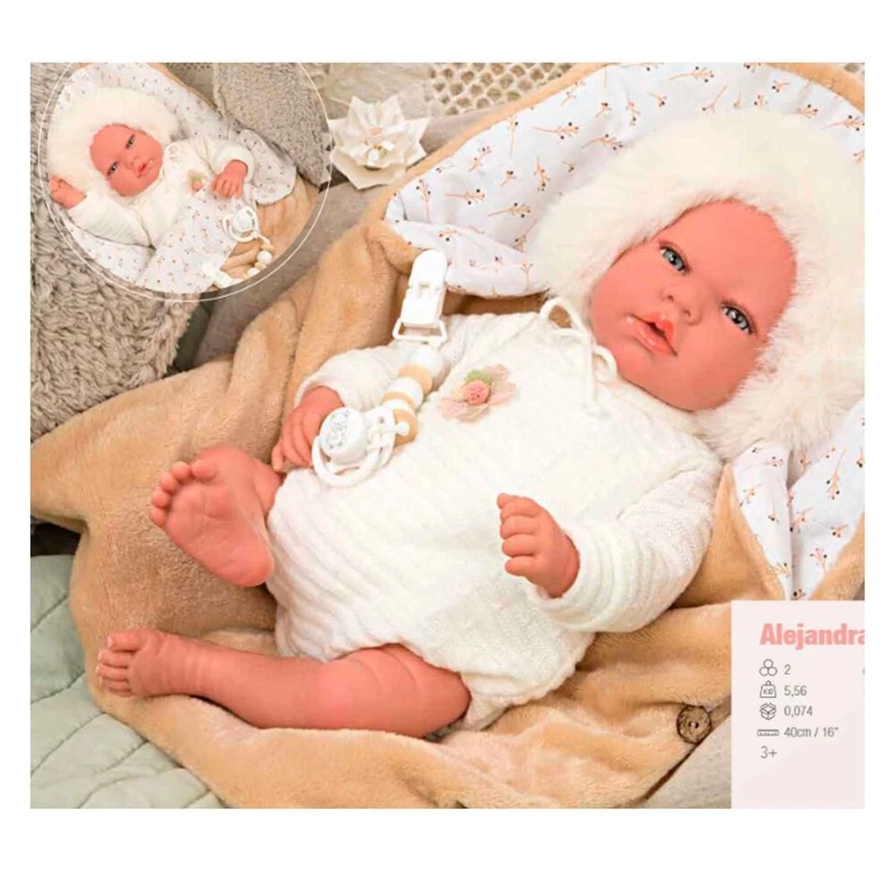 Esta preciosa muñeca Bebé Reborn de Muñecas Arias, se llama Alejandra y mide 40cm de alto. Cuenta con chupete. Su cuerpo es blando y sus extremidades de vinilo. Esta muñeca tiene 5,56kg de peso, como los de verdad. Incluye saco de dormir ADVERTENCIA: No recomendable para menores de 3 años, ya que contiene piezas pequeñas que podrían provocar asfixia en caso de ser ingeridas por el niño/a.
