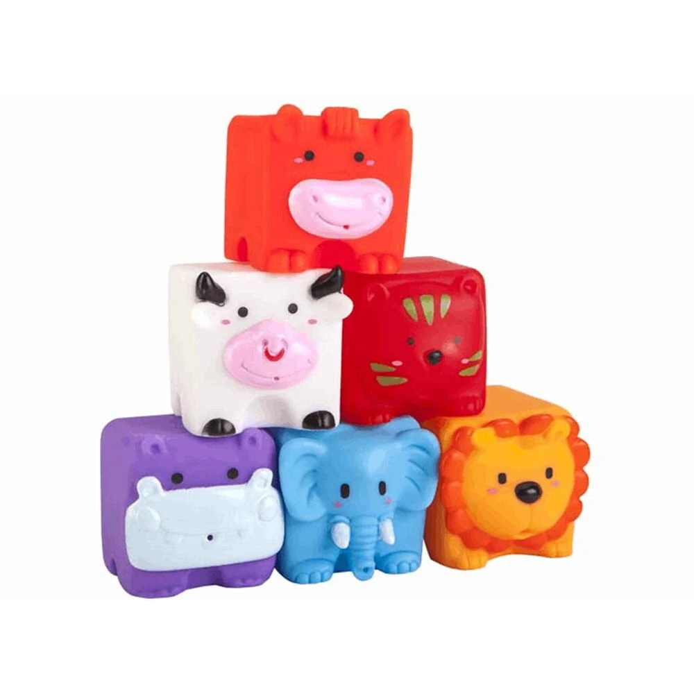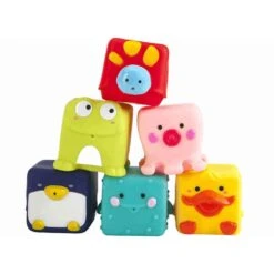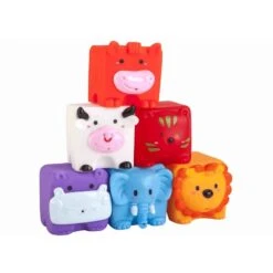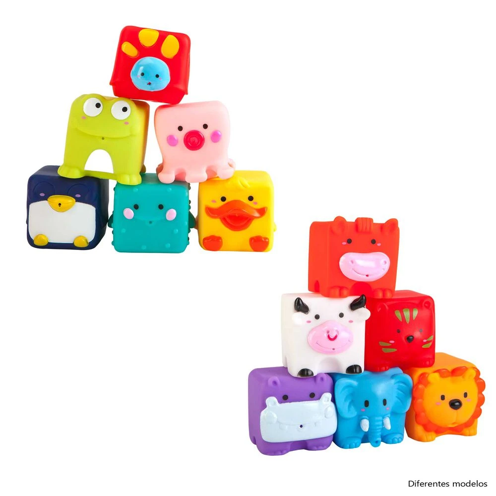 Incluye 6 cubos con forma de animalitos de alegres colores que podrás apilar además de presionar para que te mojen. Hay 2 modelos diferentes y cada modelo incluye distintos animales.