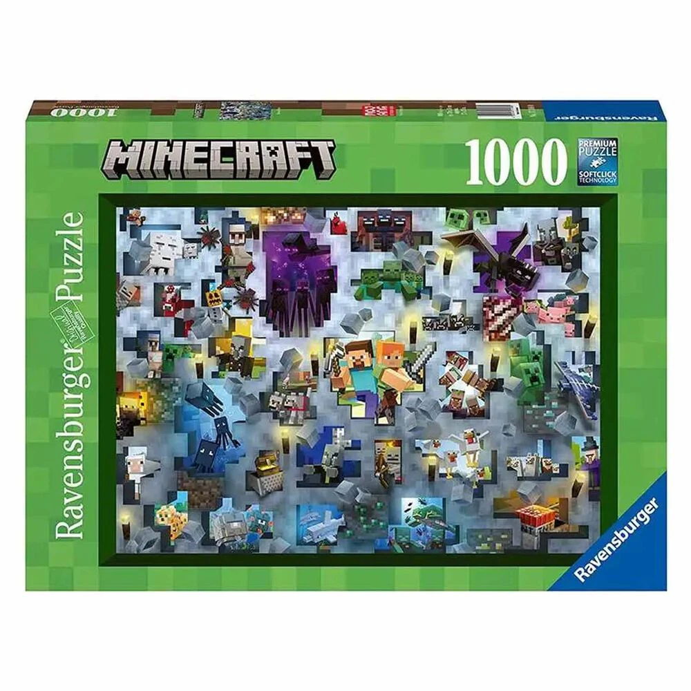 Puzzle Ravensburger de 1000 piezas con imagen de Minecraft. Los Puzzles Ravensburger son de calidad pieza a pieza. Las piezas sion siempre distintas, troqueladas con cortadoras hechas a mano. Además, las piezas ensamblan perfectamente, con acabados especiales libres de reflejos y piezas resistentes que no se doblan. Están fabricadas con cartón reciclado.
