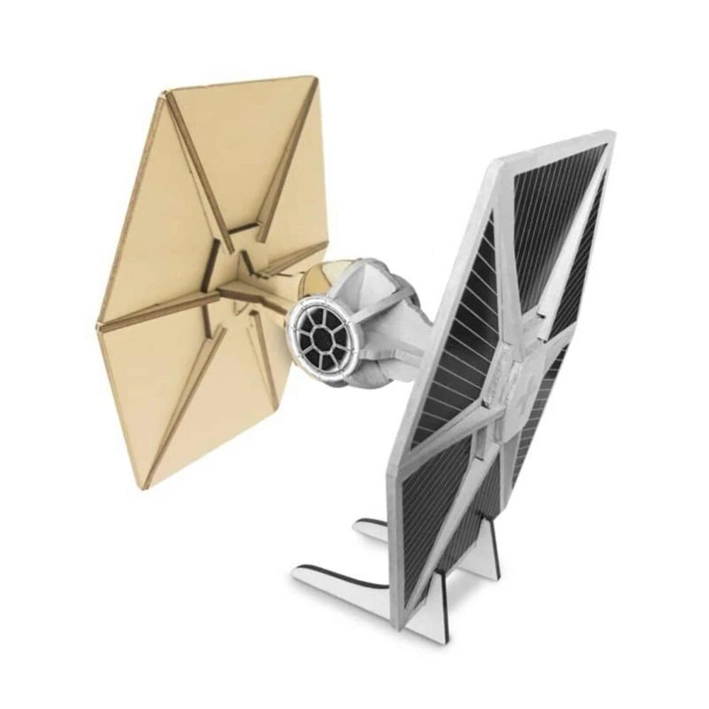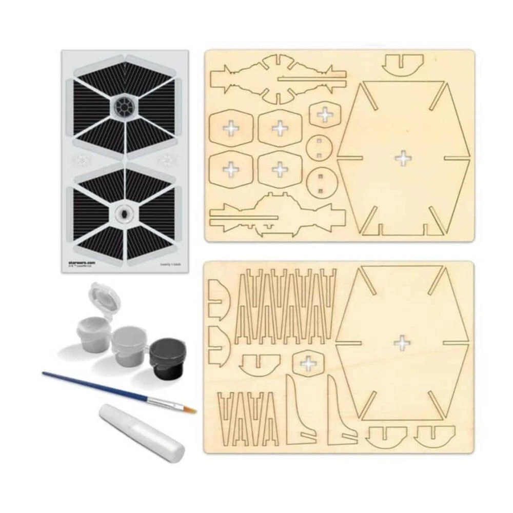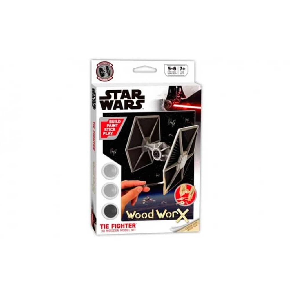 Te traemos una súper novedad que encantará a cualquier fan de Star Wars, ¡Una maqueta de madera para pintar! Esta maqueta representa a los Tie Fighter, lo reconocerás por su diseño, los cazas TIE son cazas estelares de uno o dos tripulantes que se caracterizan por ser pequeños, rápidos y maniobrables. El kit se compone de 32 piezas, 3 pinturas, pincel, pegatinas, pegamento e instrucciones. Estos puzles 3D de Woodworx están diseñados para que puedan ser armados y coloreados por los niños con el objetivo de divertirse en el proceso y al mismo tiempo alimentar la concentración y atención por las habilidades manuales. Decora las habitaciones de tus niños de manera original con estos puzzles que podrán personalizar y dar un toque único. Están fabricados con materiales naturales y cuentan con diseños oficiales de las mejores licencias y los personajes favoritos de tus hijos. Recomendado para niños mayores de 5 años. No recomendable para menores de 3 años, ya que contiene piezas pequeñas que podrían provocar asfixia en caso de ser ingeridas por el niño/a.